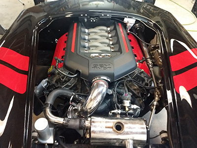 This is Mark Lembeck's 1968 Camaro RS Z28. It was an original 302 car, but too many pieces were missing to authenticate properly. We Pro toured the car, a former California race car at one time. We replaced the rear Quarter panels and the outer wheel houses because they had been cut out for big tires (no rust in this car). We installed Chris Alston rear 4 link system, a 9-inch Currie rear axle with coil overs, the front is all tubular A arms with coil overs and a Big sway bar, brand new ZL1 427 (2012) all aluminum engine from GM performance, 5-speed trans rated for 1000 HP Transmission from American power train, ceramic coated custom exhaust system, custom Interior, hidden sound system, and a Baldwin Motion style hood to top it off. To finish, we added custom carbon Fiber paint details through out the car.